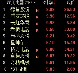 家用电器板块盘中拉升。盾安环境、德昌股份、长虹华意封板,老板电器、康盛股份、星帅尔、格力电器、富佳股份涨超6%。