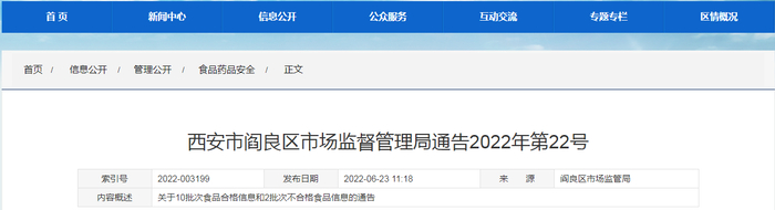 中国质量新闻网讯 6月23日,西安市阎良区市场监督管理局发布通告(2022年第22号)称,近期,该局组织抽检餐饮食品、炒货食品及坚果制品、食用农产品等3类食品12批次样品,抽样检验项目合格样品10批次,不合格样品2批次。