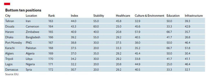 法国巴黎、英国伦敦、美国纽约分列第 19 名、第 33 名和第 51 名。中国北京排名第 71 名。大马士革仍是全球最不宜居的城市。