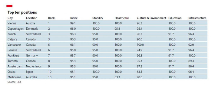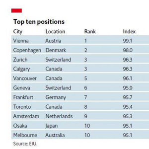 结果显示,奥地利首都维也纳位列榜首。丹麦哥本哈根位列第二,瑞士苏黎世、加拿大卡尔加里并列第三。跻身前十名的城市还包括瑞士日内瓦、德国法兰克福、荷兰阿姆斯特丹、日本大阪、澳大利亚墨尔本以及加拿大的温哥华、多伦多。