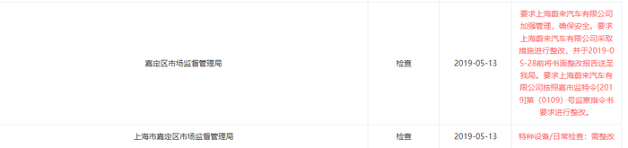 2019年,蔚来就曾被监管部门要求整改。根据企查查显示,上海蔚来汽车有限公司因抽检问题,被嘉定区市场监督管理局要求“加强管理,确保安全。要求上海蔚来汽车有限公司采取措施进行整改,并将书面整改报告送至我局。要求上海蔚来汽车有限公司按照嘉市监特令[2019]第(0109)号监察指令书要求进行整改。”(上海蔚来汽车有限公司由蔚来控股有限公司100%持股,注册资本30亿美元。)