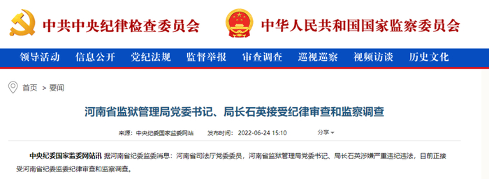 中央纪委国家监委网站6月24日讯,据河南省纪委监委消息:河南省司法厅党委委员,河南省监狱管理局党委书记、局长石英涉嫌严重违纪违法,目前正接受河南省纪委监委纪律审查和监察调查。