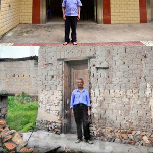 拼版照片。上图:吴传寿在现在住的二层半小楼前留影;下图:吴传寿10年前在自家土坯房前留影。(受访者供图)