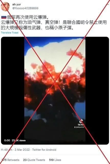 同一个视频在三月初被传作“俄军在乌克兰使用云爆弹”证明。