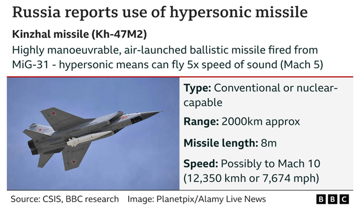 BBC在今年3月19日同样提到“匕首”:“根据俄罗斯官员的说法,Kinzhal可以击中2000公里(1240英里)以外的目标,并且可以以超过6000公里的速度飞行。”