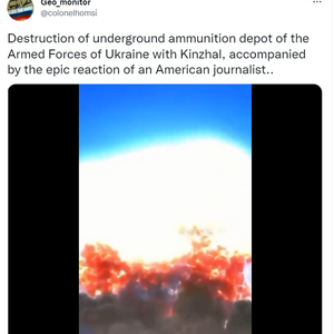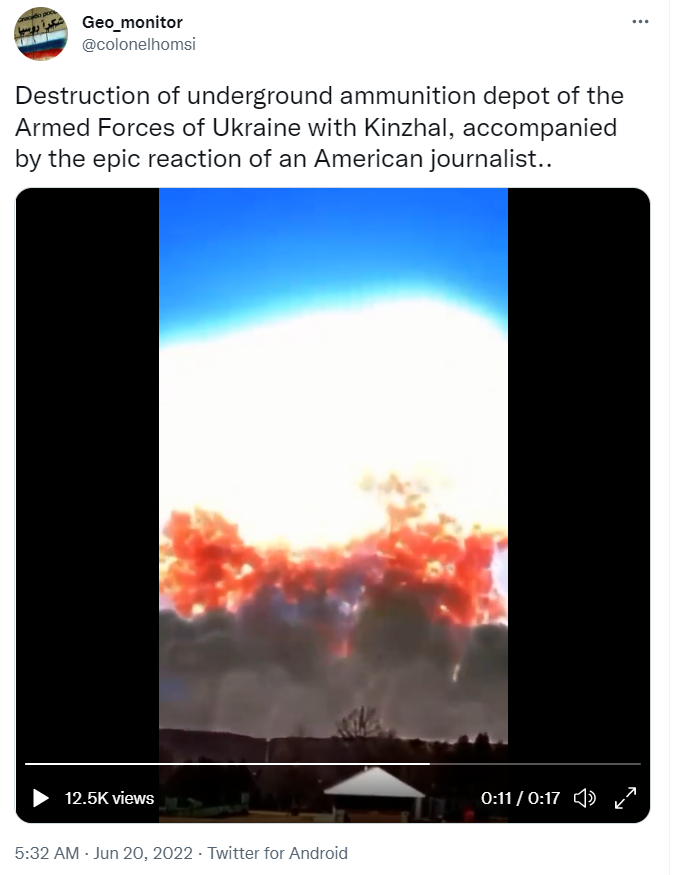 一条与爆炸相关的视频近日在推特上流传。文字说明显示:“用‘匕首’摧毁乌克兰武装部队的地下弹药库,伴随着一位美国记者的史诗般的反应。”