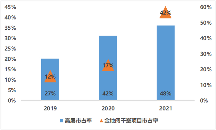 聚焦到城市经济轴线-南京路旁的海光寺板块,住宅产品类型以高层为主,金地阅千峯推出的洋房产品,填补了近十年海光寺板块市场空白。近年市内六区总价1000万以上商品住宅成交套数市场占有率逐年递增,2021年达到48%,更加体现市内六区高层产品越来越多,洋房产品更加稀缺。金地阅千峯自入市以来,市场占有率连续三年上升,2021年几乎更是金地阅千峯支撑起了天津市内六区豪宅市场。