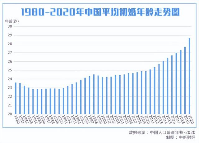 根据《中国人口普查年鉴-2020》,2020年,中国人平均初婚年龄涨到了28.67岁,其中,男性平均初婚年龄为29.38岁,女性为27.95岁。