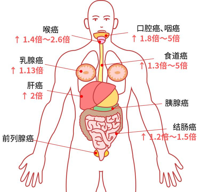 饮酒者患各种癌症的概率都会增大