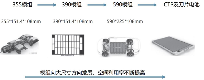 电动车为提升续航里程,需在有限的底盘空间内应提升体积利用率,尽可能多地放置动力电池以增加实际带电量。复盘动力电池模组演变过程,模组由差异化向标准化发展以降低开发成本,并逐步向大型化、无模组化发展以提升体积利用率并进一步推动降本。