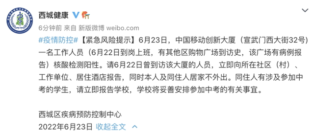 6月23日,中国移动创新大楼(宣武门西大街32号)一名工作人员(6月22日到岗上班,有其他区购物广场到访史,该广场有病例报告)核酸检测阳性。