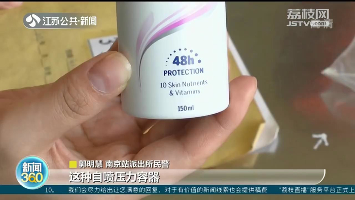 南京站派出所民警郭明慧说,像这种鞋袜除臭喷雾,和我们平时使用过的发胶、冷烫精这种自喷压力容器,没有小火苗这种标志的,不属于易燃易爆品,但它属于压力容器的,以前的标准是限制携带120毫升以内。7月1日新规实施以后,限制携带标准变为150毫升以内。