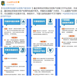 对此,公安部刑事侦查局官方微博在6月23日发布提醒称,不要对个人的金融账户——包括银行卡、支付宝、微信支付等——进行5种操作,它们都属于高风险操作,可能导致账户被冻结——