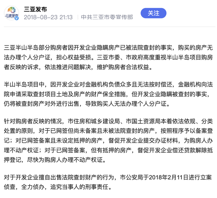 三亚方面发布的情况通报显示,半山半岛项目中,因开发企业对金融机构负债众多且无法按时偿还,金融机构向法院申请采取查封项目土地及房产的财产保全措施,但开发企业隐瞒被查封的事实,仍将被查封房产对外进行出售,导致购买人无法办理个人分户证。对于开发企业擅自出售法院查封财产的行为,市公安局于2018年2月11日进行立案侦查,全力侦办,追究当事人的刑事责任。