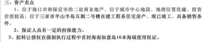 这两笔资产转让信息的共同点是,在抵押担保和资产卖点上,均含有半山半岛项目地块和部分住宅房产。值得注意的是,同人实业的资产卖点还包括“拟转让债权在强制执行过程中首封海南如意岛16本海域使用权证”。