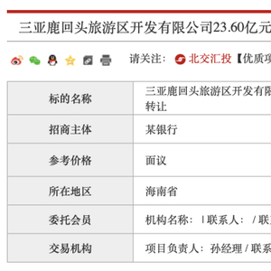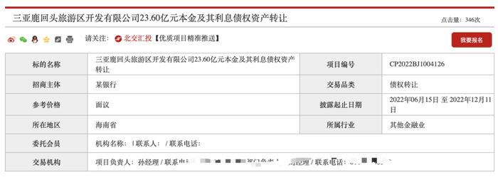 6月22日-23日,北京产权交易所接连挂出了三亚鹿回头旅游区开发有限公司(下称鹿回头公司)23.60亿元本金及其利息债权、上海同人实业有限公司(下称同人实业)28.82亿元本金及其利息债权两笔资产转让信息。