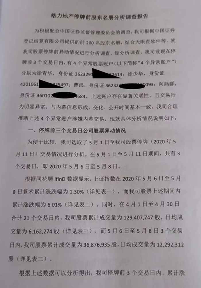 为配合调查,格力地产制作了一份《格力地产停牌前股东名册分析调查报告》(以下简称《报告》),作为此次《举报信》的附件。