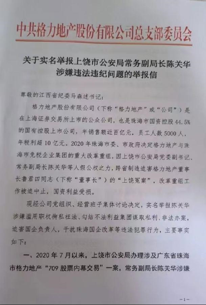 最近,一封署名为鲁君四的《控告书》和一封落款为中共格力地产股份有限公司总支部委员会的《举报信》在网络上流传。