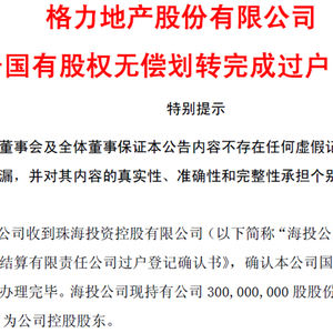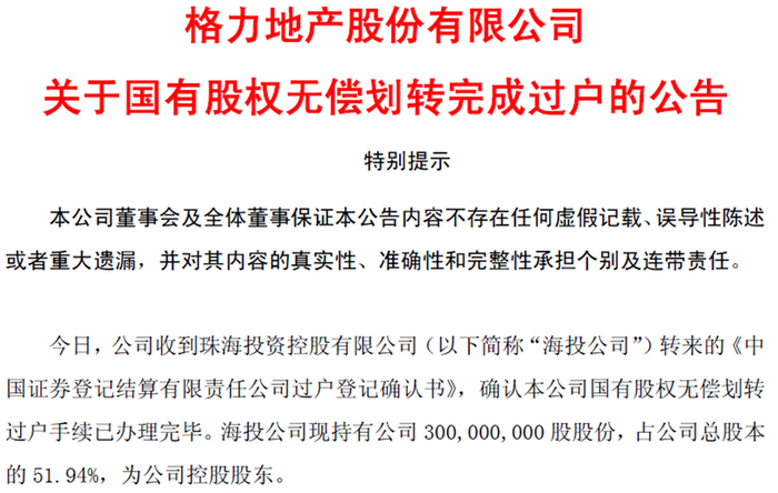 次年5月,格力集团就将持有的3亿股格力地产股份无偿划转给珠海投资控股有限公司。