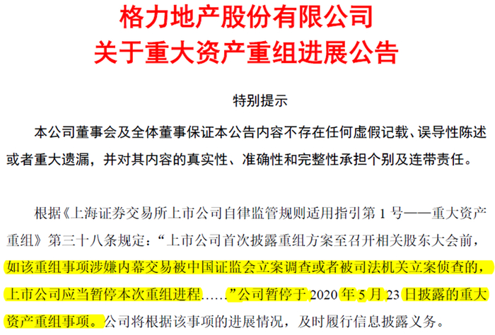 《报告》显示,在发布重大资产重组公告前,格力地产原定于2020年4月30日停牌,然而,该公司“因审批决策程序导致无法如期停牌”,停牌时间拖延至5月11日。