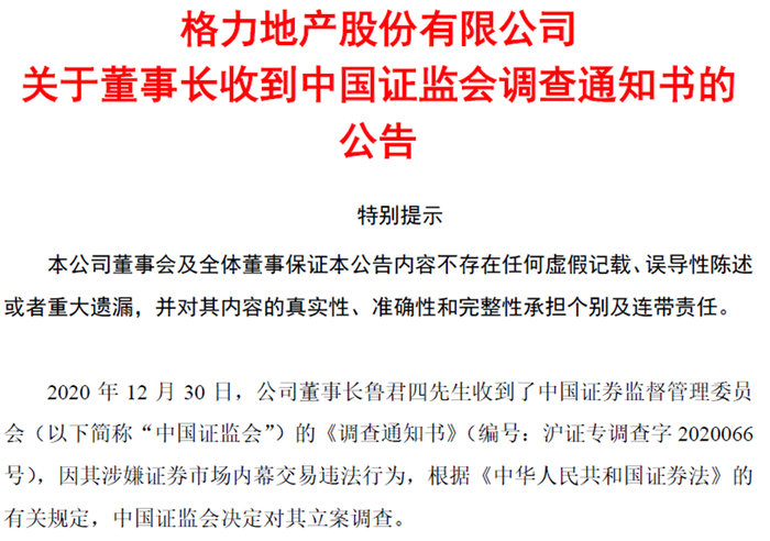 2020年12月30日,格力地产发公告称,公司董事长鲁君四收到了证监会的《调查通知书》,因其涉嫌证券市场内幕交易违法行为,证监会决定对其立案调查。