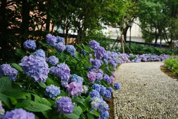 3年前,月亮湾花园建成开放。居民惊喜地发现,出小区走200多米,就有规模可观的绣球花景观。