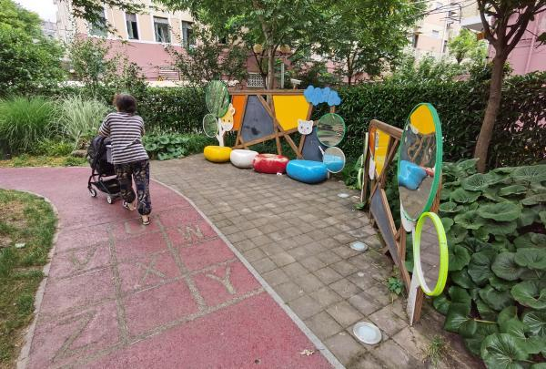 2019年11月,去东余杭路幼儿园接孙女的陆阿姨有了新发现,园门口原本一块拆迁后的空地,被改建成了一座充满童趣的童梦园。