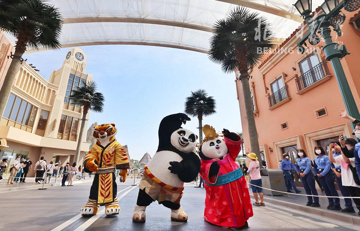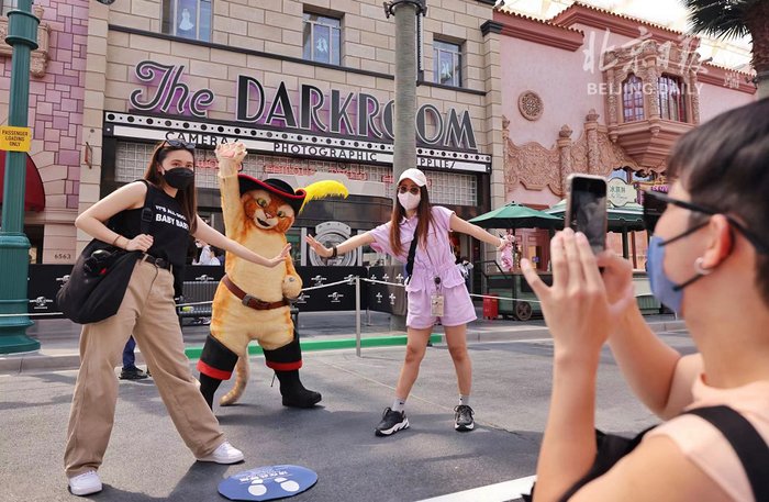 上午9时35分,北京环球影城迎来首批游客入园,随后一场开场舞表演带游客重回“大片世界”。数位经典电影人物携舞者亮相好莱坞大道,阿宝、美美、悍娇虎三位功夫大侠,以及啄木鸟伍迪和温妮、穿靴子的猫等与游客互动,共同见证欢乐重聚的时刻。