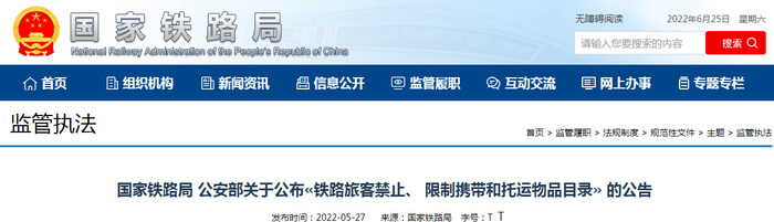近日,国家铁路局、公安部公布最新《铁路旅客禁止、限制携带和托运物品目录》的公告,将于2022年7月1日起施行。