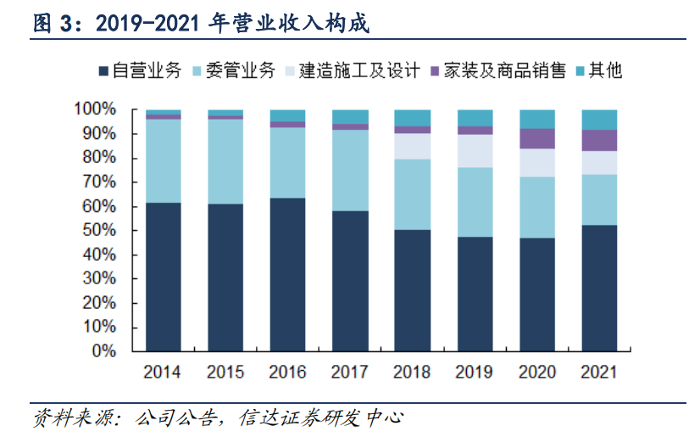 2021年,红星美凯龙的业绩大头仍然是自营商场,同比增长21.1%,占总收入比重从2020年的46.9%扩大到52.2%;委管商场这厢,包括项目前期品牌咨询委托管理服务收入、项目年度品牌咨询委托管理服务收入、商业咨询费及招商佣金等,总收入为32.56亿元,较上年减少9.1%。