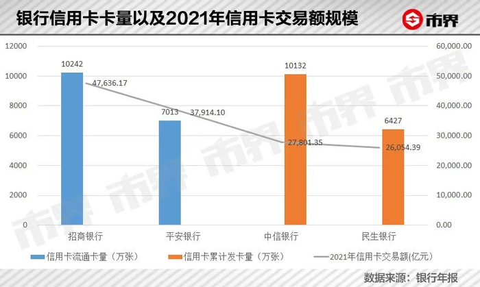 从发卡量和信用卡交易规模来看,民生银行从成立至今累计发卡量约为6427万张,2021年的交易规模为2.61万亿。但与其它几家信用卡头部银行比起来,可以说是差距明显——招商银行凭借1.02亿张流通卡(累计发卡量减去注销卡量)和4.76万亿的交易金额拔得头筹;其余几家包括中信、平安在内的信用卡头部银行也稳扎稳打。相比之下,民生银行有一定差距。