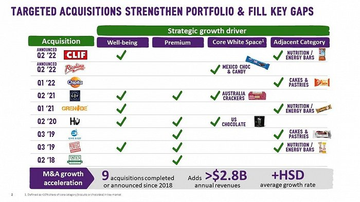 在2021年,亿滋收购了英国营养食品公司 Grenade,以及澳大利亚饼干公司Gourmet Food Holdings、美国健康零食公司Hu。
