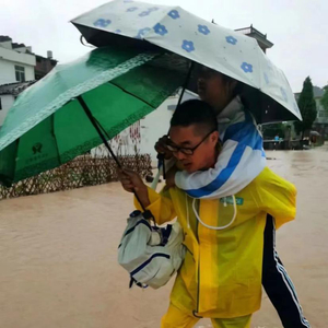 “娜妮(玉山方言,小女孩),抱牢了!叔叔背你过去!”将小女孩牢牢固定在身后,短短数十米却走了十几分钟,占水禄费力蹚过湍急的黄泥水,终让父女俩重聚。女孩父亲紧紧握住占水禄的手不住道谢,但占水禄却来不及多说,转身就和其他干部一同去转移其他群众。