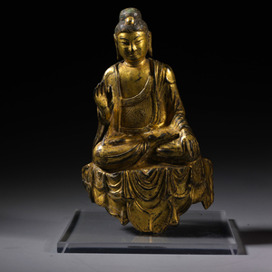 唐代释迦佛鎏金铜坐像,按20公分、15公分和10公分左右的高度,可分为大、中、小三型,上海博物馆藏有多件唐代释迦佛鎏金铜坐像,且形成系列。其中,大型造像馆藏共有三件,属于唐代释迦佛鎏金铜坐像中规制、尺寸较大的造像。