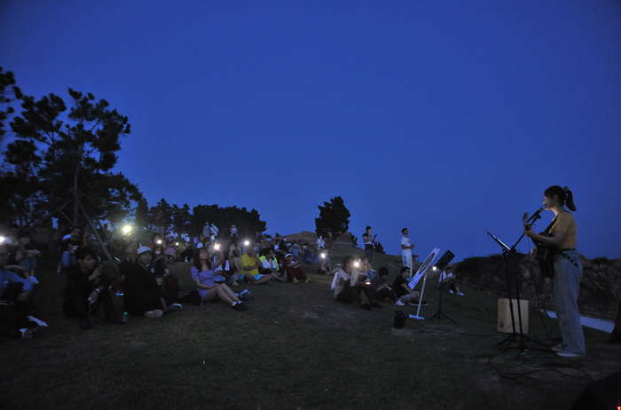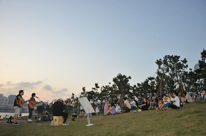 草坪上简单的几块野餐布,没有过于复杂的音响设备和绚丽的灯光,只有乐器弹奏的声音和沁人心脾的歌声,路过的人都想停下来,