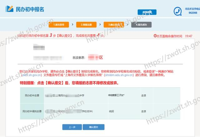 家长在网上报名民办学校时,请务必仔细阅读相关民办学校的招生简章,特别是民办学校的招生计划类型及其条件、收费标准等。部分报名志愿须家长确认是否符合报名条件,一旦填报并确认提交,不得再次报名、更改或放弃报名信息。