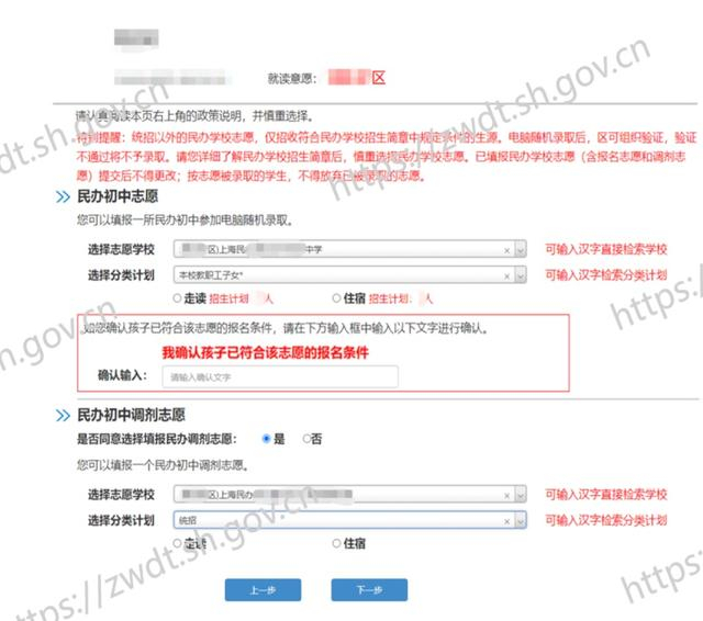家长需先确认就读区,然后请在下拉列表中慎重选择志愿学校。需要特别提醒的是选择分类计划为“统招”以外的民办学校志愿的学生,需要确认符合该志愿的报名条件。