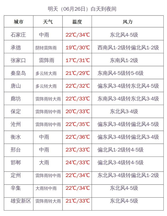 今天夜间到27日,全省阴,承德南部、唐山、秦皇岛、廊坊、雄安新区、沧州、衡水东部、邢台东部、邯郸东部有大雨到暴雨,局地有大暴雨,其他地区有小到中雨。