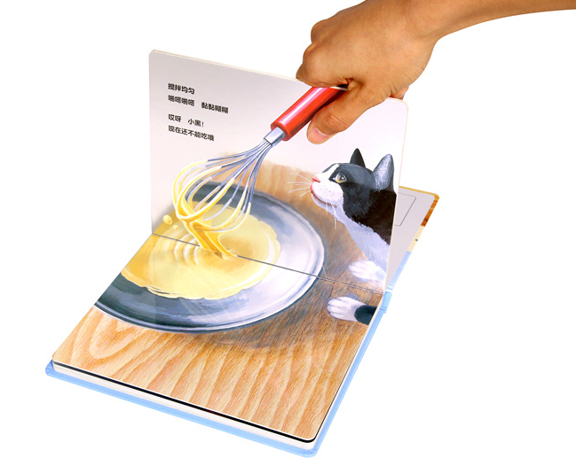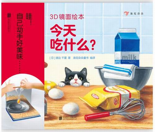 《今天吃什么》是一本镜面反射绘本,当把绘本打开90度,两侧呈现的倒影会形成立体效果,可以带给孩子不一样的视觉体验和空间感受。这本书讲的是小猫观看主人做薄烤饼的全过程。