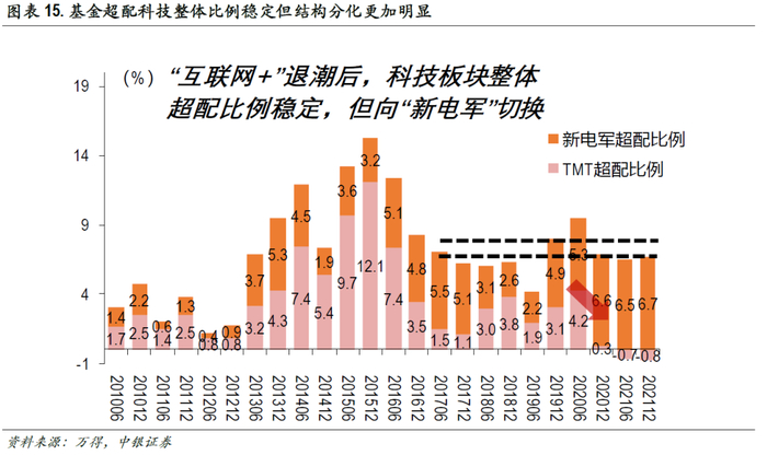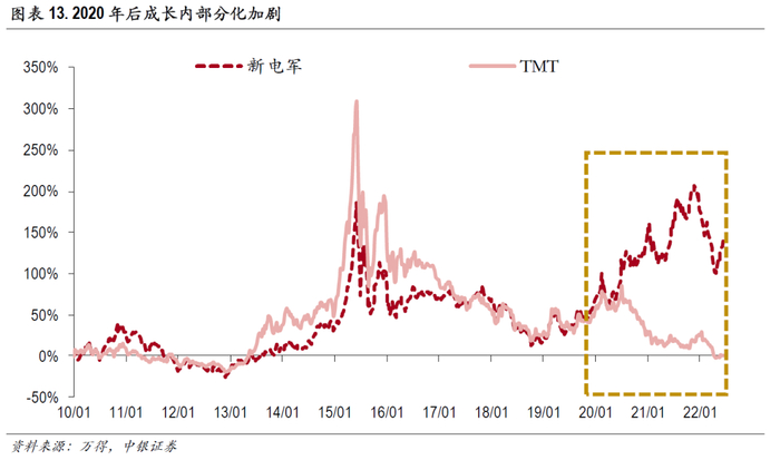 在景气分化的同时,我们注意到,自2016年后互联网+行情带来的TMT牛市扰动结束后,公募基金对“新电军+TMT“这六个科技成长行业长期超配比例大部分时间稳定在6%-8%区间,整体超配幅度保持稳定,但从内部结构拆解来看,2020年后在总比例保持不变的前提下,持续主动降低TMT行业超配比例,头寸完全向新电军行业倾斜,科技成长内部软、硬科技板块在存量总资金、存量总景气,以及基本面相对景气尚无法扭转的背景下持续分化。