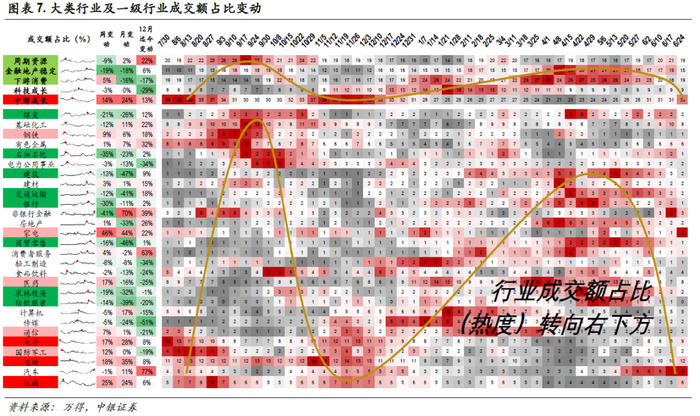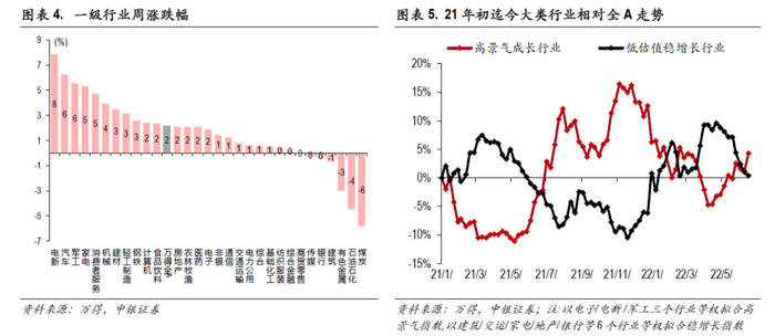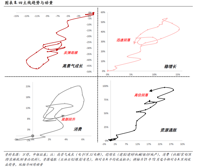 高景气延续与消费企稳。自4月底触底回升以来,高景气成长反弹动量与持续性较强,消费类行业回落后近两周明显企稳回升。稳增长的预期消退与资源通胀的价格回落,随着经济向上拐点预期的出现,稳增长行情的窗口期逐步面临关闭,资源通胀链相关行业在美国衰退预期下跟随大宗商品价格回落而承压。四条主线中,稳增长与资源通胀逻辑方面面临一定压力,阻力最小的方向仍在成长与消费方向。建议继续关注我们在中期策略报告中推荐的超配方向:电新/半导体/军工/食品饮料/农林牧渔,汽车行业短期涨速过快,热度与拥挤度较高,短期或面临一定波动,但销售放量贝塔与国产汽车链价值份额提升的阿尔法趋势未变。