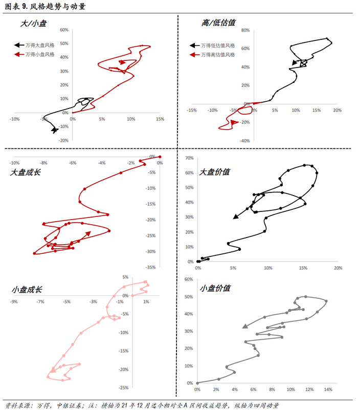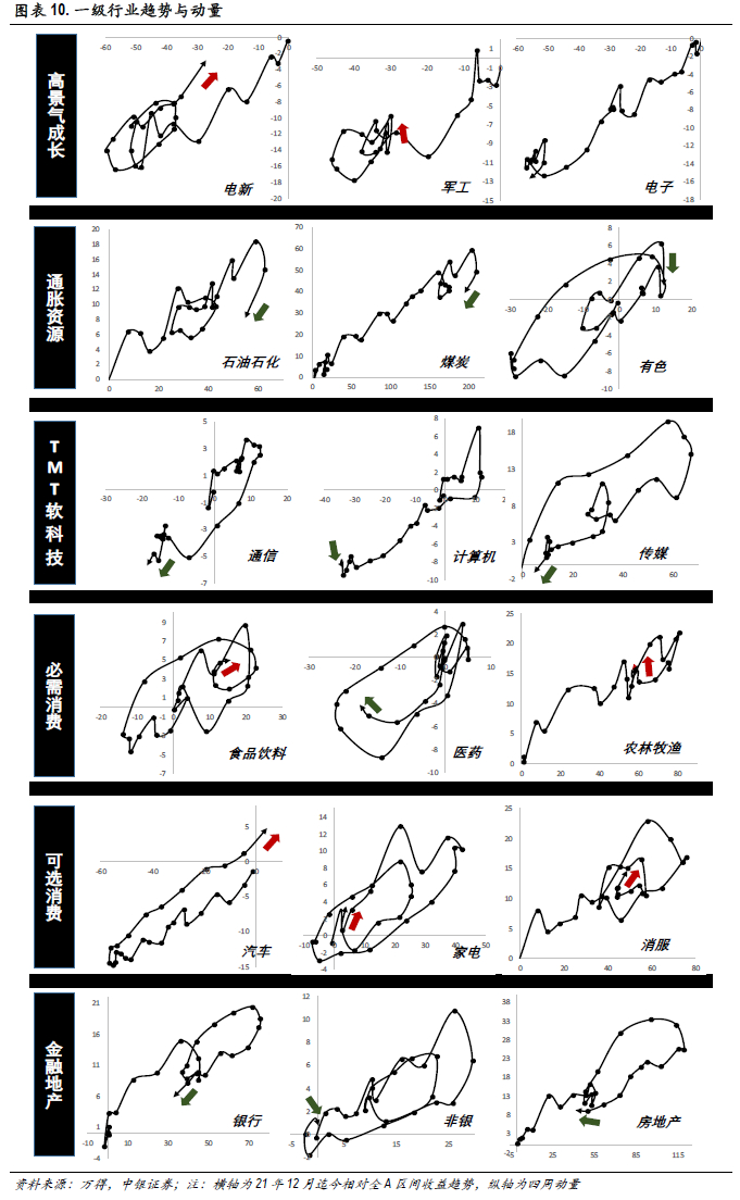 从我们构建的相对收益趋势与动量图(RMG,Relative return trend and Momentum Graph)来观察各主线区间超额收益趋势与短期动量的走势,横轴为主线行业相对全A区间收益率变动,纵轴为其四周动量,横向代表相对收益趋势,方向变动表征跑赢/跑输全A,纵向代表短期动量。