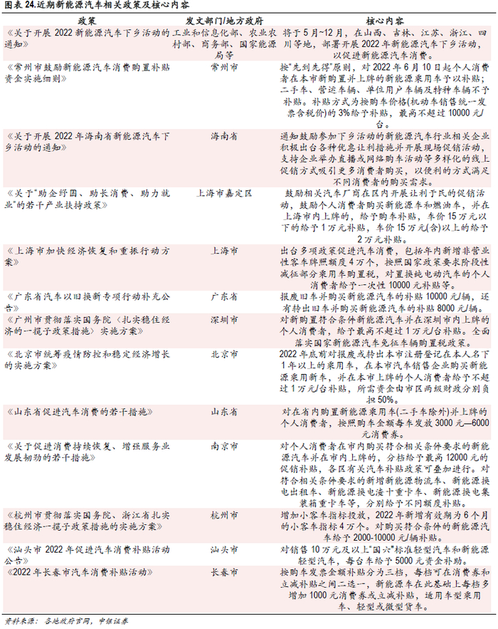 优惠政策密集落地,新能源汽车或再迎红利期。近段时间以来,各大地区为进一步释放消费潜力促进消费,加快促进消费回补和潜力释放,提振消费信心,陆续出台促进消费若干措施或政策,新能源汽车或再迎政策红利期。