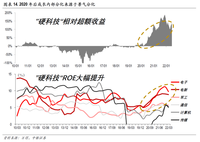 成长内部天平倾斜具有持续性。此前科技成长内部所谓“硬科技”新半军行业与“软科技”TMT行业走势出现了超过两年的大幅悖离。在我们判断下半年成长风格将继续占优的背景下,这种成长内部的分化裂口扩大趋势会保持延续。