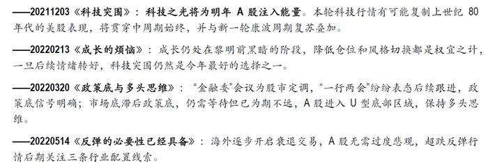 策略视角的大宗商品研究,我们有一定储备。在2020和2021年分别发布了两篇商品的深度报告《一波三折,新周期下的工业品行情推演》,《周期视角下的商品轮动》。两篇报告总结了在不同周期定位下,大宗商品的轮动特征,在偏左侧位置推荐了工业品和能化的投资机会。进入2022年在一些报告里面,我们提示大宗商品的见顶拐点。