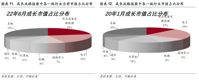 从中信成长风格指数成分股中各一级行业的数量和市值占比分布来看,63%的成分股来源于“新电军 +TMT行业”,两者数量占比较为均衡,“电新电子军工”与“计算机通信传媒”市值占比从此前(2020年1月,41%/33%)较为均衡的结构转变为结构性失衡(2022年6月,51%/18%)。