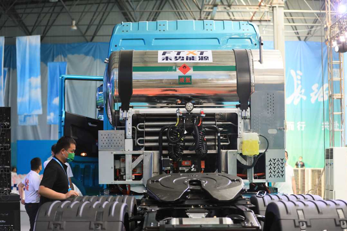 河北长征汽车制造有限公司举行新能源重卡上市活动,客商在了解车辆性能。