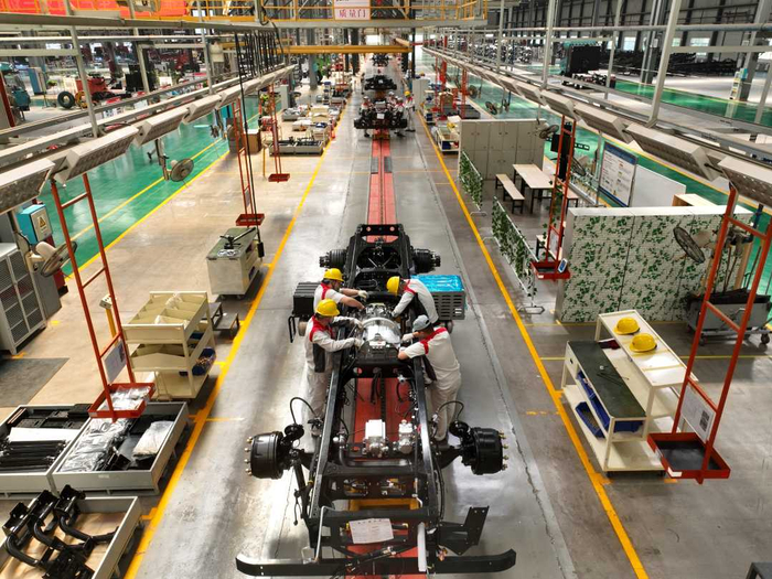 在河北长征汽车制造有限公司总装车间内,工人正在组装新能源重卡零部件。