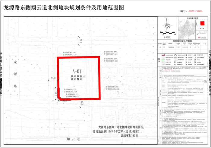 龙源路东侧、翔云道北侧地块,面积17.02亩,规划用地性质为二类居住用地,容积率1.0<R≤2.0,建筑密度≤28%,建筑限高≤54米,绿地率≥35%。