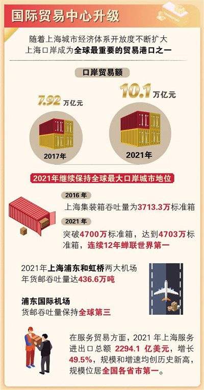 口岸贸易额从2017年的7.92万亿元增至2021年的10.1万亿元,这也使上海在2021年继续保持全球最大口岸城市地位。